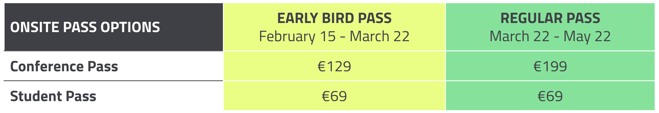 Note: The Student Pass is for current full-time students and faculty members. Please send us a copy of a valid student identification to info@containerdays.io to get an access code.